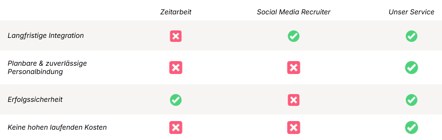 Wir stimmen uns persönlich mit Ihnen ab, berücksichtigen die Besonderheiten Ihrer Einrichtung und Ihres Umfelds, prüfen lokale Angebote – und finden passende Mitarbeitende, die wirklich zu Ihnen passen.